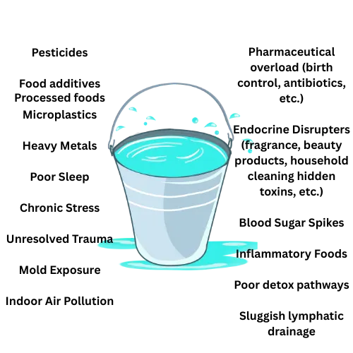 Every day, your body is exposed to pesticides, plastics, beauty products, cleaning chemicals, and pollutants. Over time, these fill your toxic bucket until your system can’t cope, leading to: